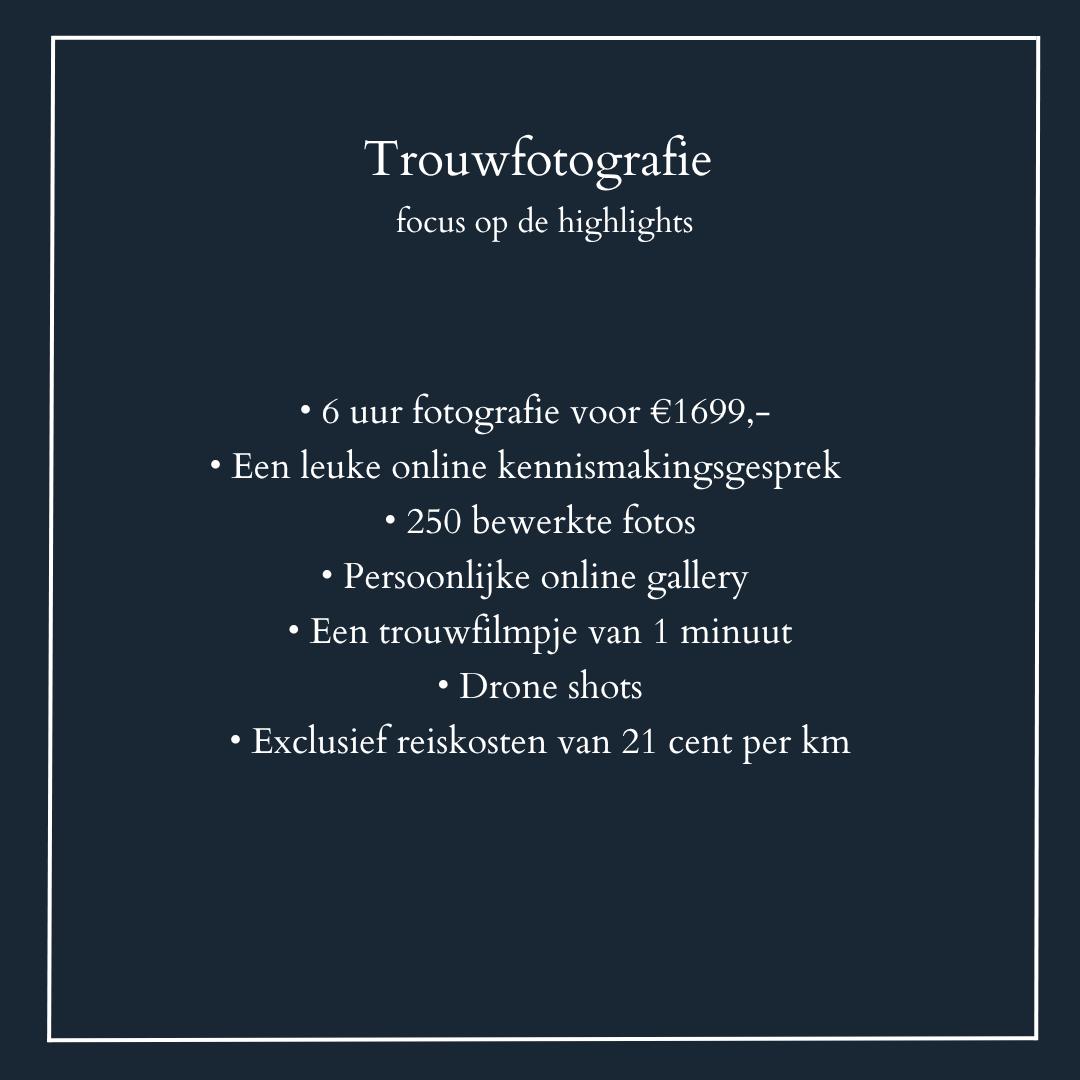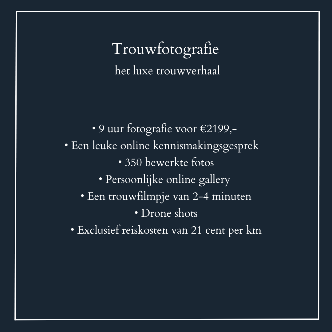 Wil jij graag jouw speciale dag laten vastleggen? Dan zorg ik voor de beste resultaten! Mijn stijl is creatief, warm, fun en moody. Mijn doel is om het gevoel van de dag terug te laten komen in de foto's. In de onderstaande pakketten is maatwerk ook mogelijk.