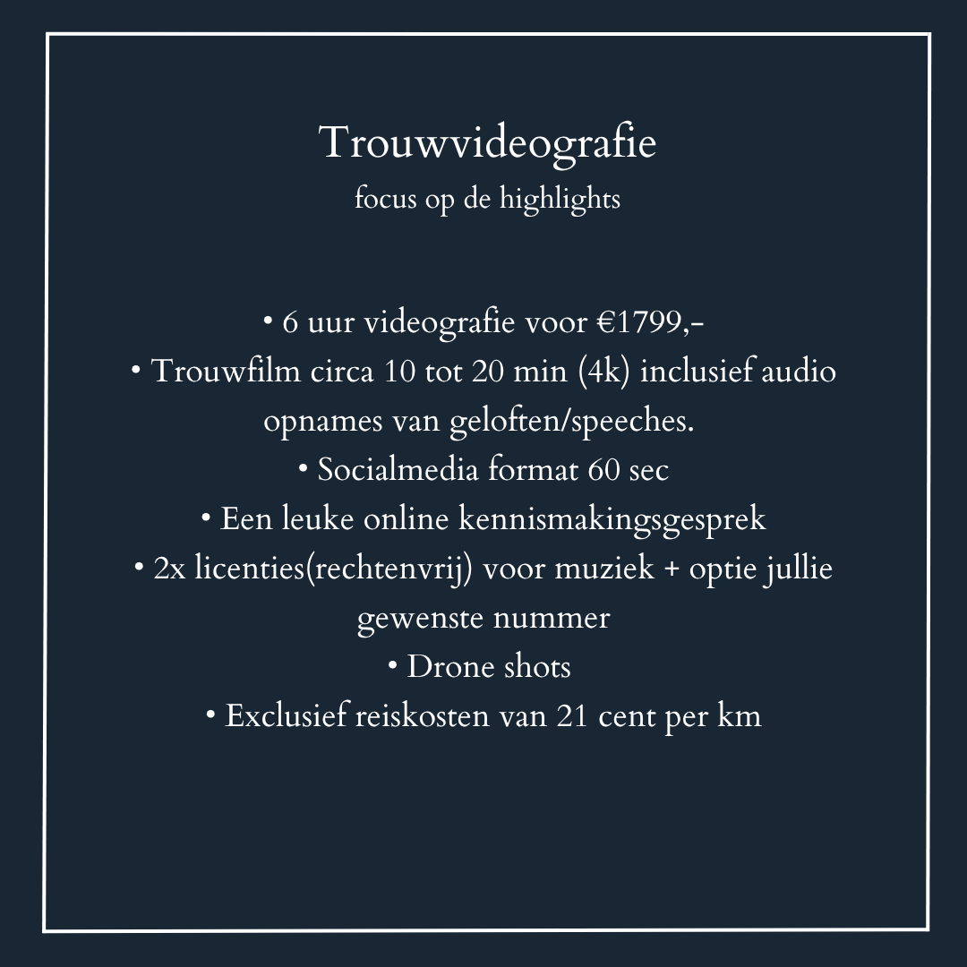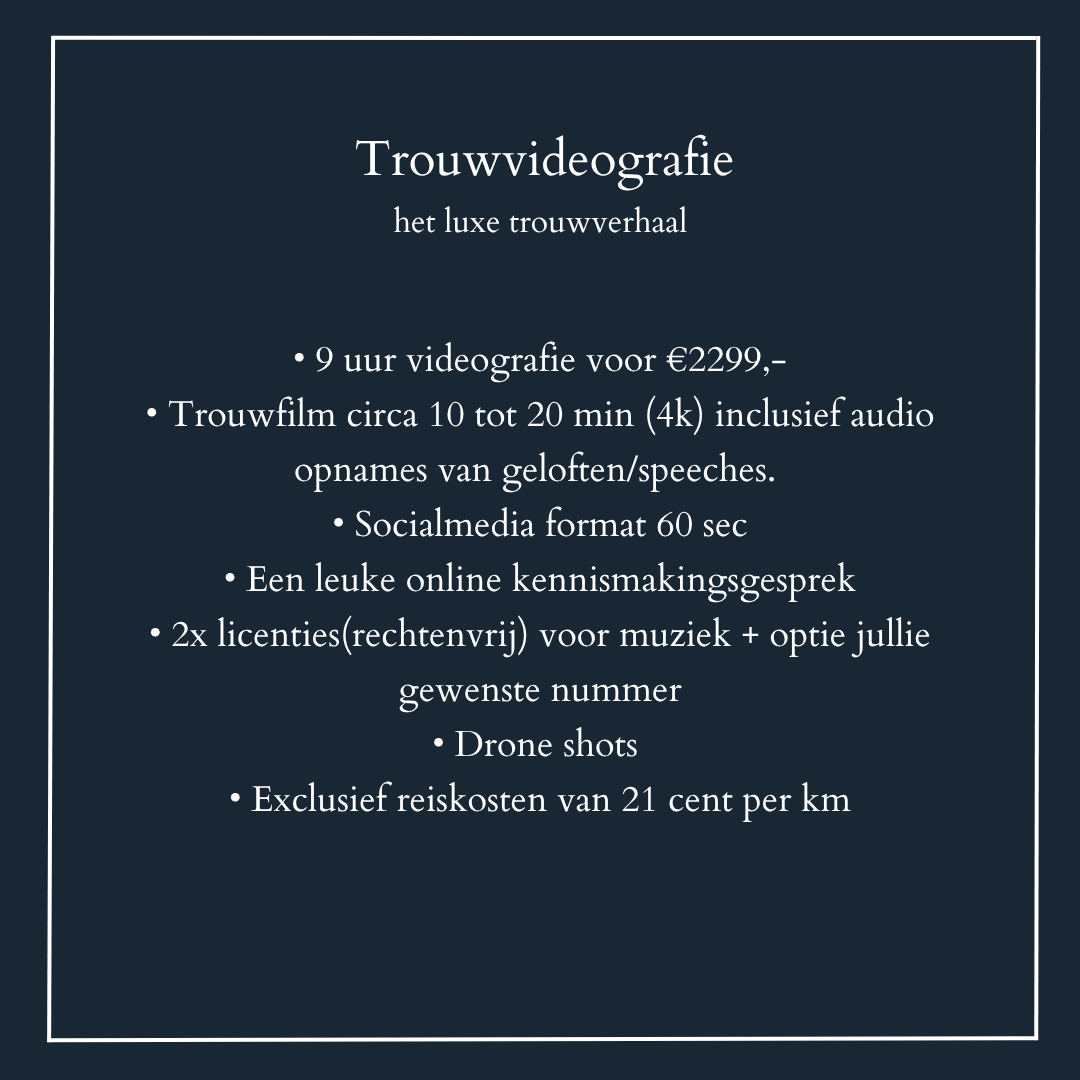 Tijdens jullie bruiloft gebeurt er zoveel tegelijk dat je onmogelijk alles kunt zien of meemaken. Terwijl jij met je partner geniet van de ceremonie, gebeuren er op de achtergrond zoveel mooie dingen: een traan van ontroering, een lach om een grappig moment. Een videograaf zorgt ervoor dat al die bijzondere momenten niet ongemerkt blijven.